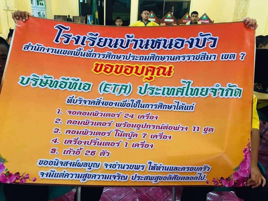 โรงเรียนบ้านหนองบัวขอขอบพระคุณ บริษัทอีทีเอ (ETA) ประเทศไทยจำกัด ที่บริจาคสิ่งของเครื่องใช้เพื่อการศึกษาได้แก่ จอคอมพิวเตอร์ 24 จอ คอมพิวเตอร์ตั้งโต๊ะ 11ชุด