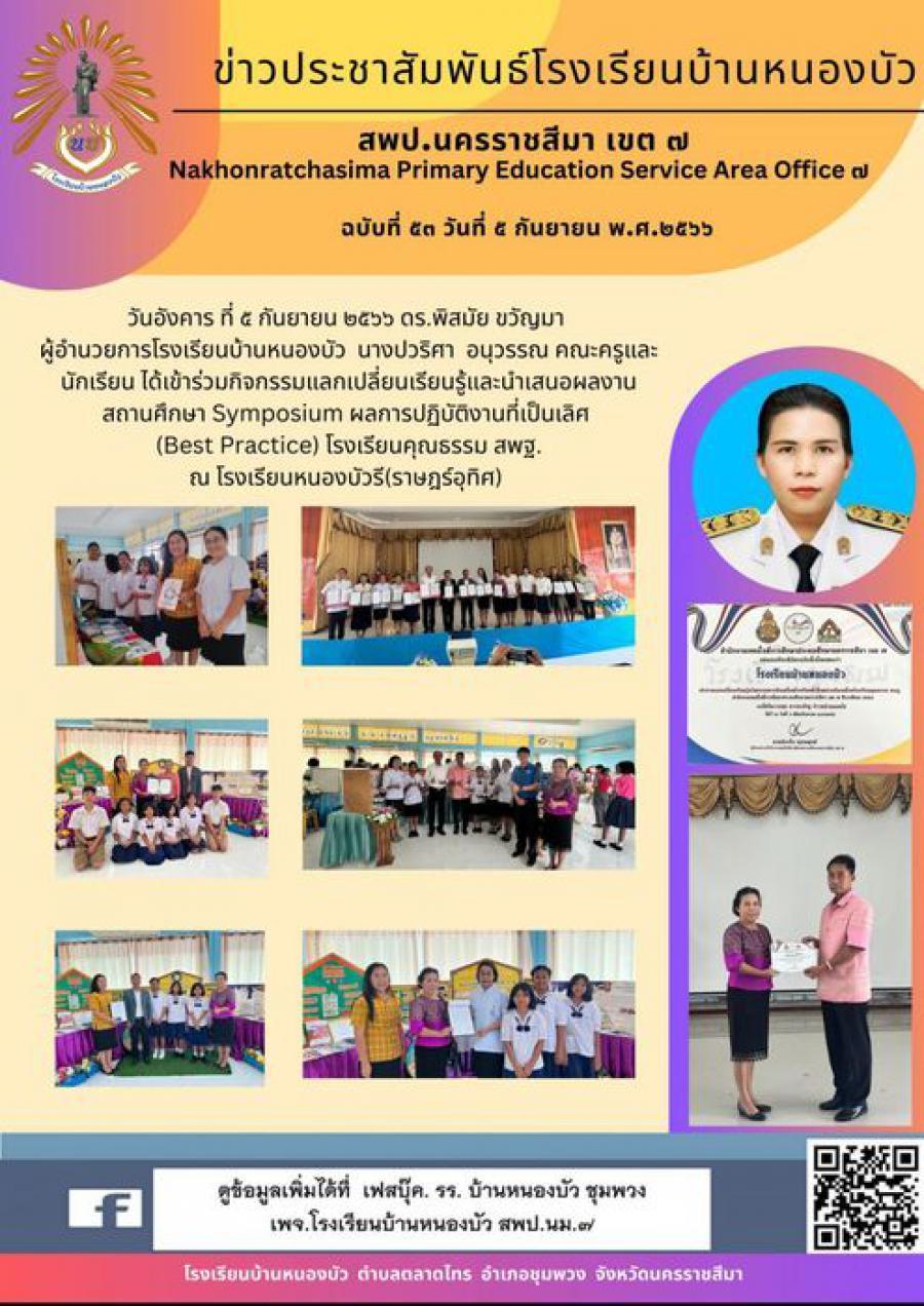 วันอังคาร ที่ ๕ กันยายน ๒๕๖๖ ดร.พิสมัย ขวัญมา ผู้อำนวยการโรงเรียนบ้านหนองบัว นางปวริศา อนุวรรณ คณะครูและนักเรียน ได้เข้าร่วมกิจกรรมแลกเปลี่ยนเรียนรู้และนำเสนอผลงานสถานศึกษา Symposium ผลการปฏิบัติงานที่เป็นเลิศ (Best Practice) โรงเรียนคุณธรรม สพฐ. ณ โรงเรียนหนองบัวรี(ราษฎร์อุทิศ) S:0