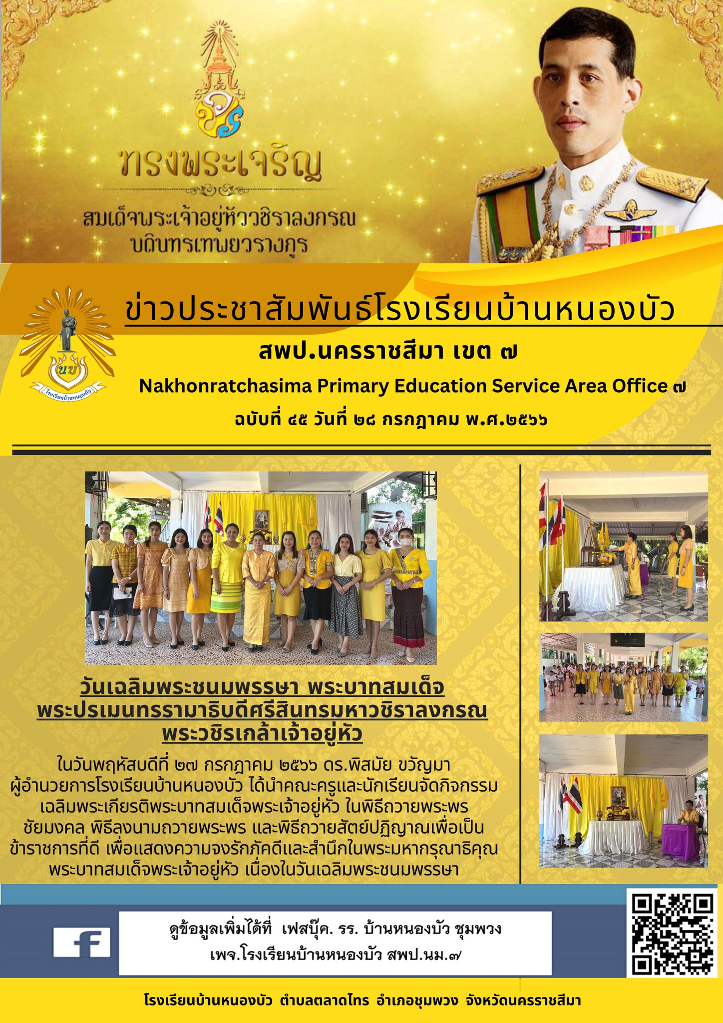 ผู้อำนวยการโรงเรียนบ้านหนองบัว ได้นำคณะครูและนักเรียนจัดกิจกรรมเฉลิมพระเกียรติพระบาทสมเด็จพระเจ้าอยู่หัว ในพิธีถวายพระพรชัยมงคล พิธีลงนามถวายพระพร และพิธีถวายสัตย์ปฏิญาณเพื่อเป็นข้าราชการที่ดี เพื่อแสดงความจงรักภัคดีและสำนึกในพระมหากรุณาธิคุณพระบาทสมเด็จพระเจ้าอยู่หัว เนื่องในวันเฉลิมพระชนมพรรษา