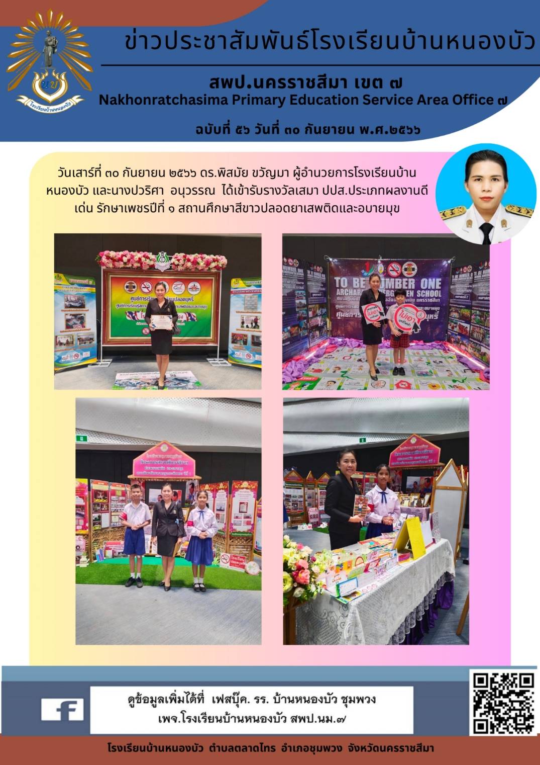 วันที่ 30 กันยายน 2566 โรงเรียนบ้านหนองบัว ได้รับรางวัลเสมา ปปส.ประเภทผลงานดีเด่น รักษาเพชรปีที่ 1 สถานสีขาวปลอดยาเสพติดและอบายมุข